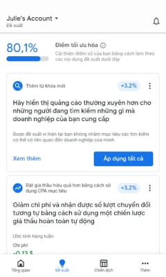Để hỗ trợ bạn đưa ra những lựa chọn thông minh nhất, Google Ads cung cấp "điểm tối ưu hóa" độc đáo, cùng với những đề xuất chiến lược được cá nhân hóa, giúp nâng cao hiệu suất quảng cáo liên tục. Ứng dụng cũng chủ động gửi các thông báo và cảnh báo quan trọng theo thời gian thực, từ bản tóm tắt hiệu suất hàng ngày cho đến những thông báo cần lưu ý về trạng thái quảng cáo. Hơn thế nữa, đội ngũ chuyên gia luôn sẵn sàng hỗ trợ bạn qua điện thoại hoặc trò chuyện trực tuyến, đảm bảo mọi vướng mắc đều được giải đáp kịp thời, giúp bạn tự tin vững bước trên con đường chinh phục thành công trong thế giới quảng cáo trực tuyến.
