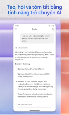Ngoài ra, ứng dụng còn là một trung tâm sáng tạo đa năng ngay trong tầm tay bạn. Dễ dàng tạo và chỉnh sửa các nội dung chuyên nghiệp như hình ảnh, áp phích, biểu ngữ, video hay khảo sát với bộ sưu tập mẫu phong phú. Quản lý tài liệu vật lý cũng trở nên đơn giản với tính năng quét tài liệu, ảnh và ghi chú trực tiếp từ điện thoại. Đối với quản lý dự án, Ghi chú Copilot là không gian lý tưởng để tổng hợp ý tưởng, tài liệu và liên kết, sau đó yêu cầu Copilot tóm tắt và xâu chuỗi thông tin một cách mạch lạc. Bạn có thể thuận tiện tải lên các tệp Word, Excel, PDF từ thiết bị để nhận phản hồi từ Copilot, và lưu trực tiếp các tệp do Copilot tạo ra vào điện thoại của mình.